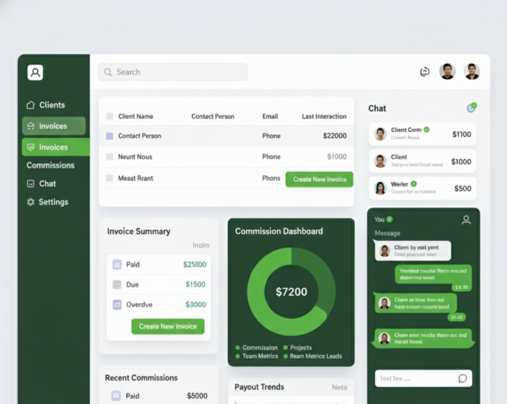 Keep client details, invoices, commissions, and chat history organized in a single platform.